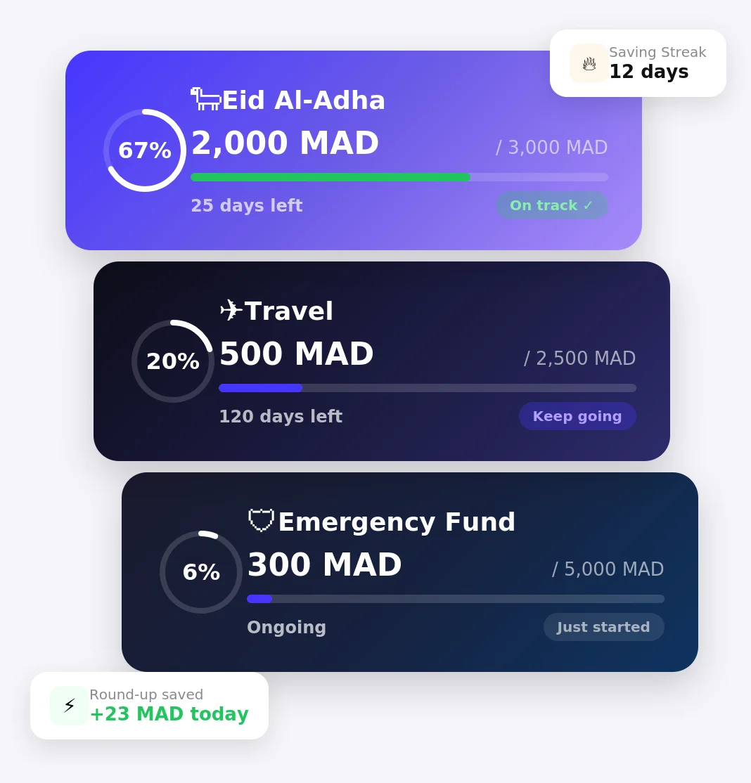Create any goal — Eid, vacation, emergency fund, wedding — name it, pick an emoji, set a deadline. Round-ups save automatically with every purchase. Challenge your friends. Earn badges. Watch your progress grow.